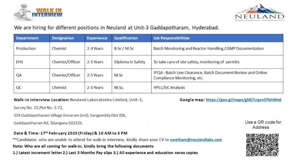 **Candidates who are unable to attend for walk-in interview, kindly share your CV to swetham@neulandlabs.com