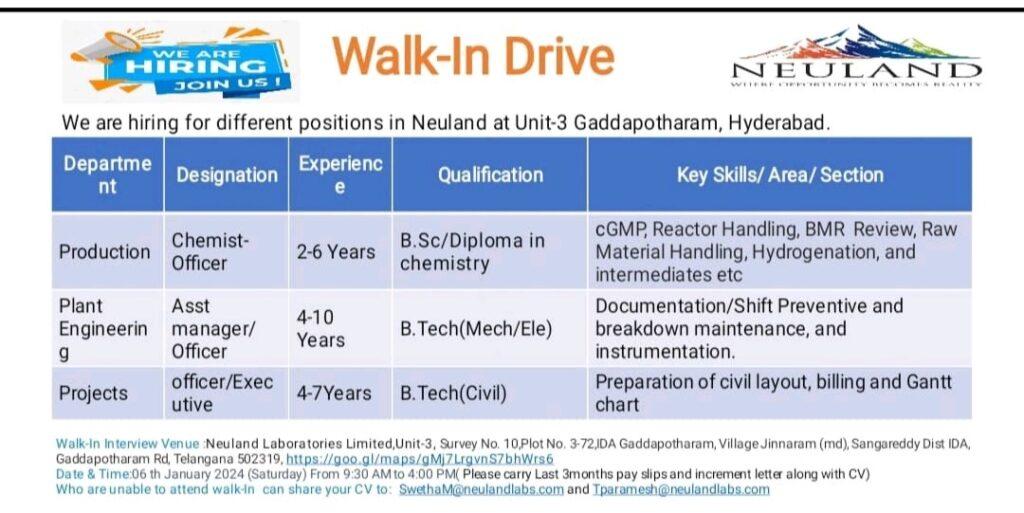 Neuland Laboratories Walk-In Drive for Chemist/ Officer/ Executive/ Asst manager – Production, Projects, Plant Engineering on 06th January 2024