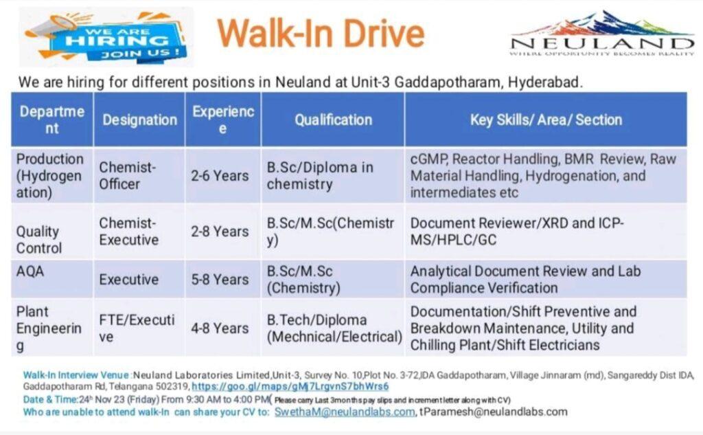 Walk-In Interview Venue: Neuland Laboratories Limited, Unit-3, Survey No. 10.Plot No. 3-72,IDA Gaddapotharam, Village Jinnaram (md), Sangareddy Dist IDA Gaddapotharam Rd, Telangana 502319, https://goo.gl/maps/gM7LrgvnS7bhWrs6