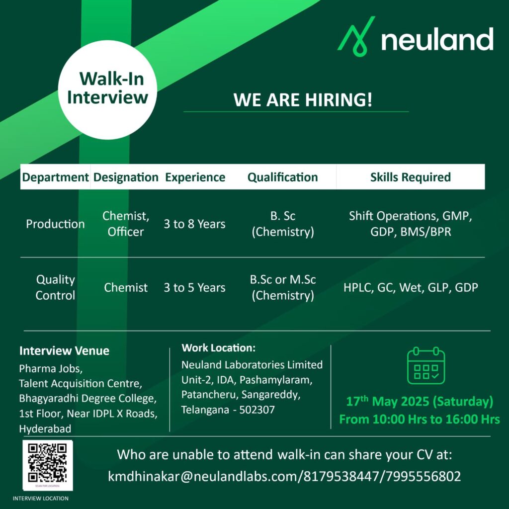 Who are unable to attend walk-in can share your CV at: kmdhinakar@neulandlabs.com/8179538447/7995556802