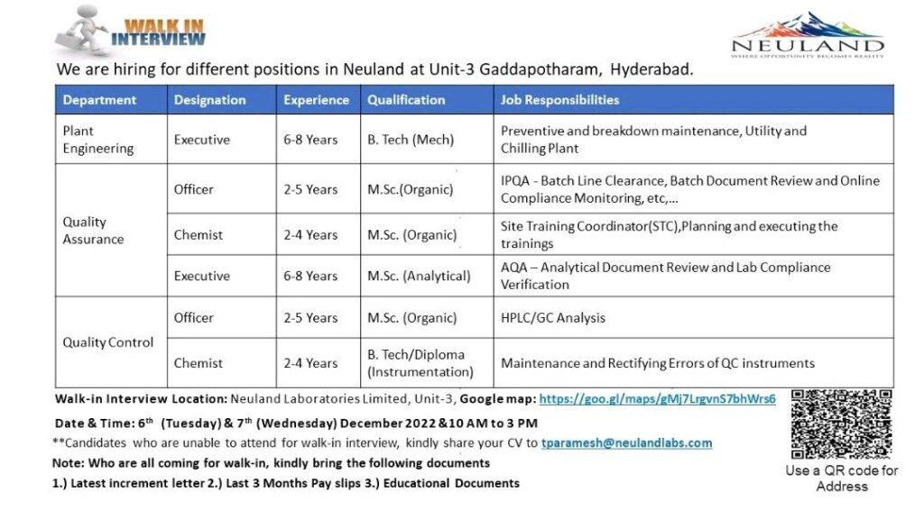 Walk-in Interview Location: Neuland Laboratories Limited, Unit-3,