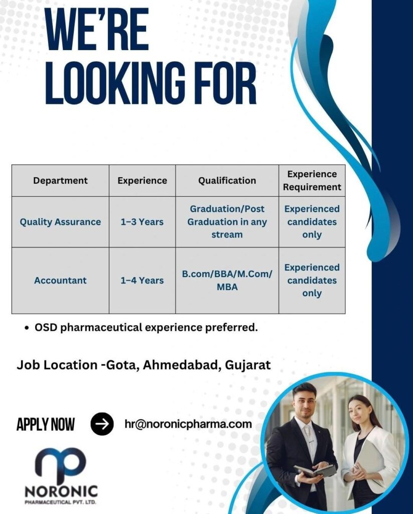 Noronic Pharmaceutical Pvt. Ltd. is currently expanding its team and inviting applications from skilled professionals for key positions at their facility in Gujarat.