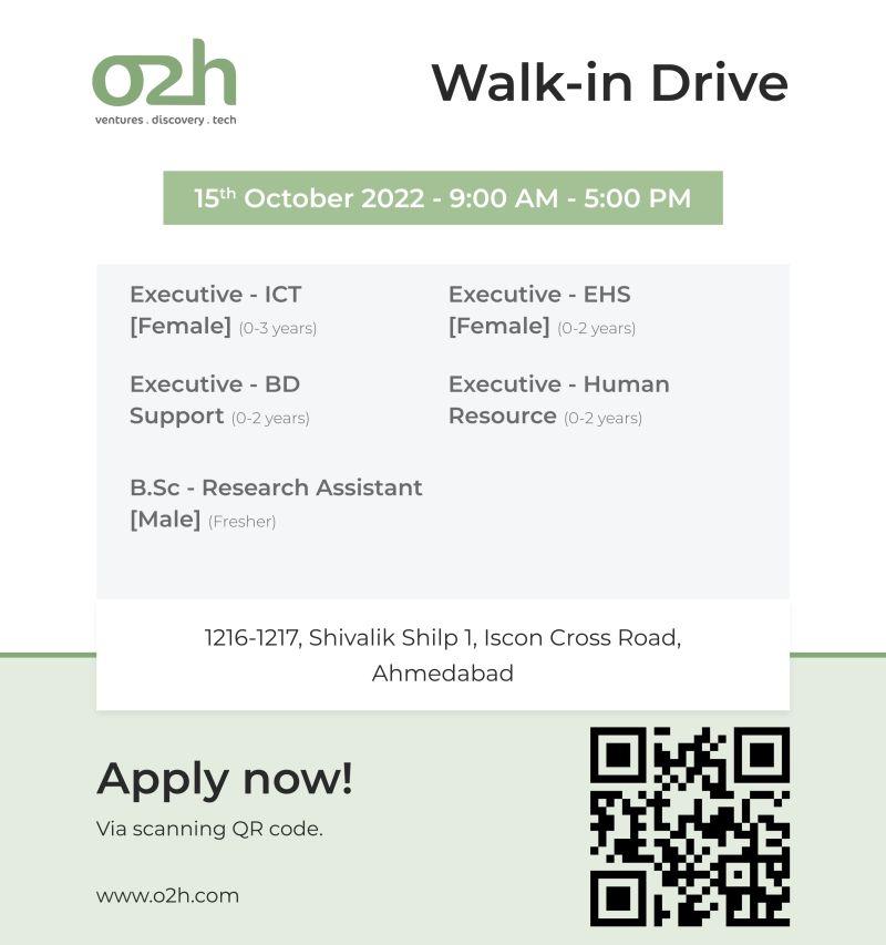 O2h Walk-in Drive for Freshers & experience in ICT/ BD/ Research Assistant / EHS & Human Resource on 15th October 2022