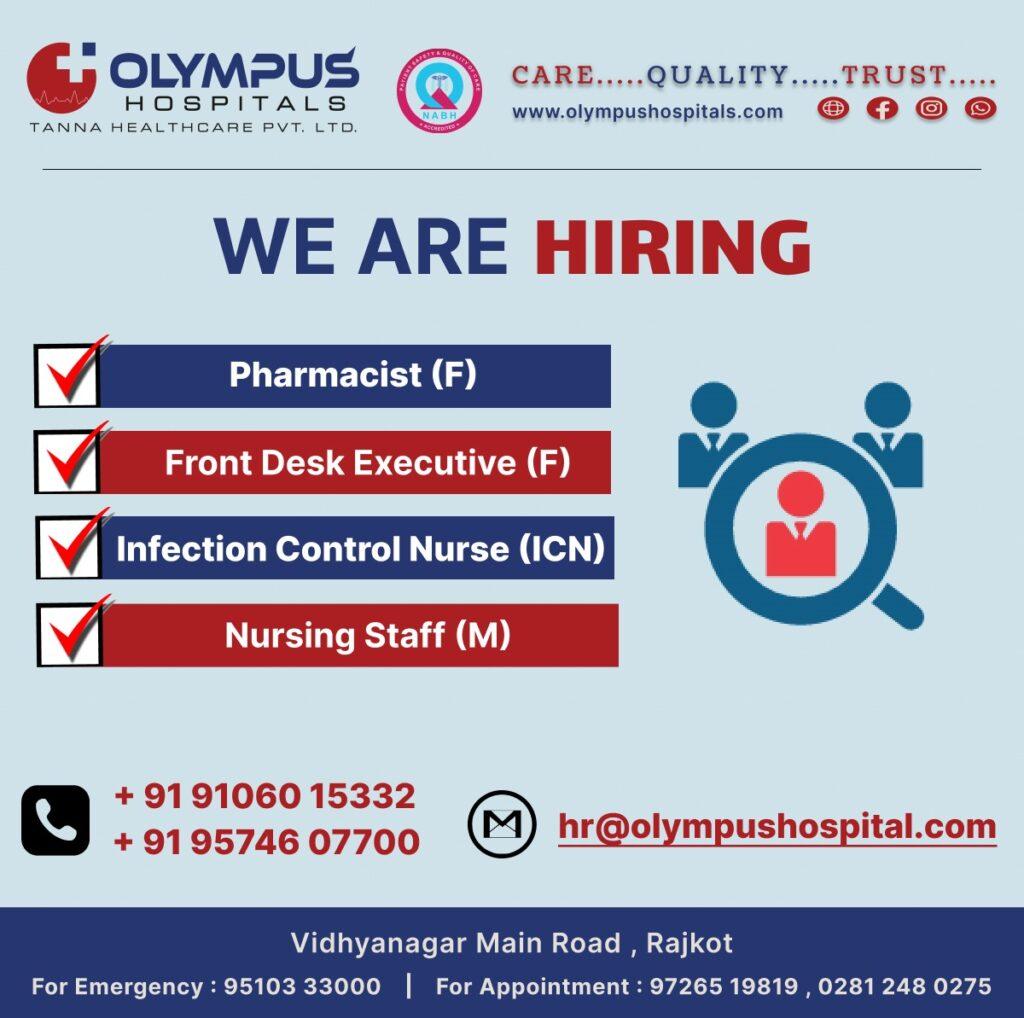 Olympus Hospital job vacancy for Pharmacist (F), Front Desk Executive (F), Infection Control Nurse (ICN) & Nursing Staff (M)