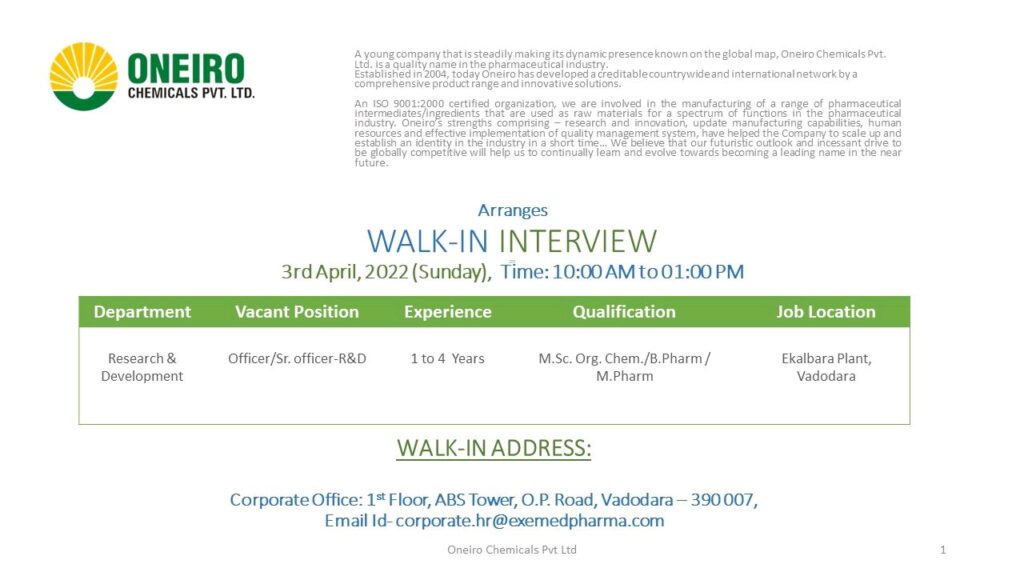 ONEIRO CHEMICALS PVT. LTD. WALK-IN INTERVIEW for Research & Development- R&D department on 3rd April, 2022