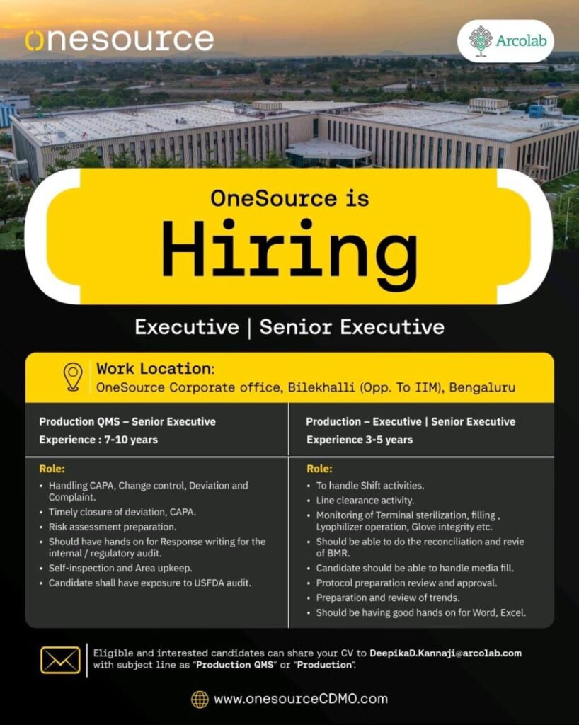 OneSource, in collaboration with Arcolab, is conducting a major recruitment drive for experienced professionals to join its Corporate Office in Bilekhalli, Bengaluru (Opposite to IIM).