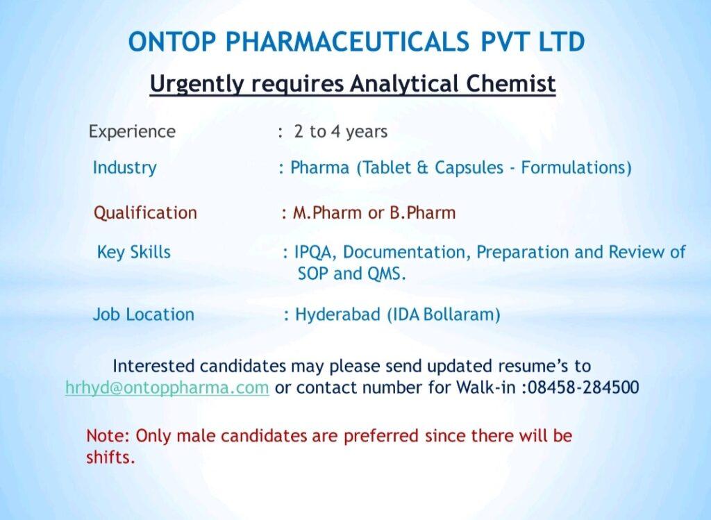 Interested candidates may please send updates resumes to hrhyd@ontoppharma.com or Contact Number for walk-in : 08458-284500
