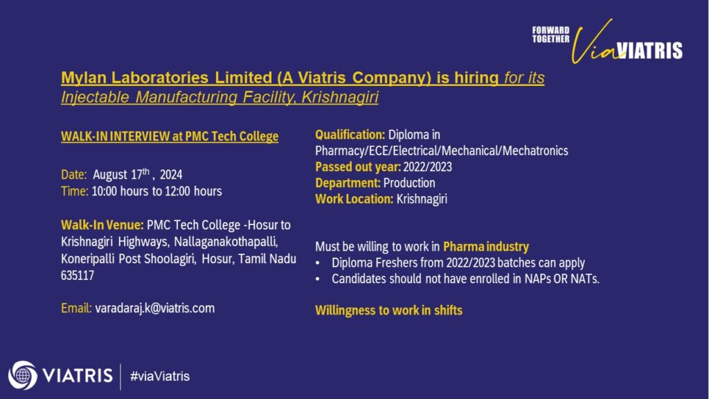 Mylan Laboratories Limited (A Viatris Company) is hiring for its Injectable Manufacturing Facility, Krishnagiri