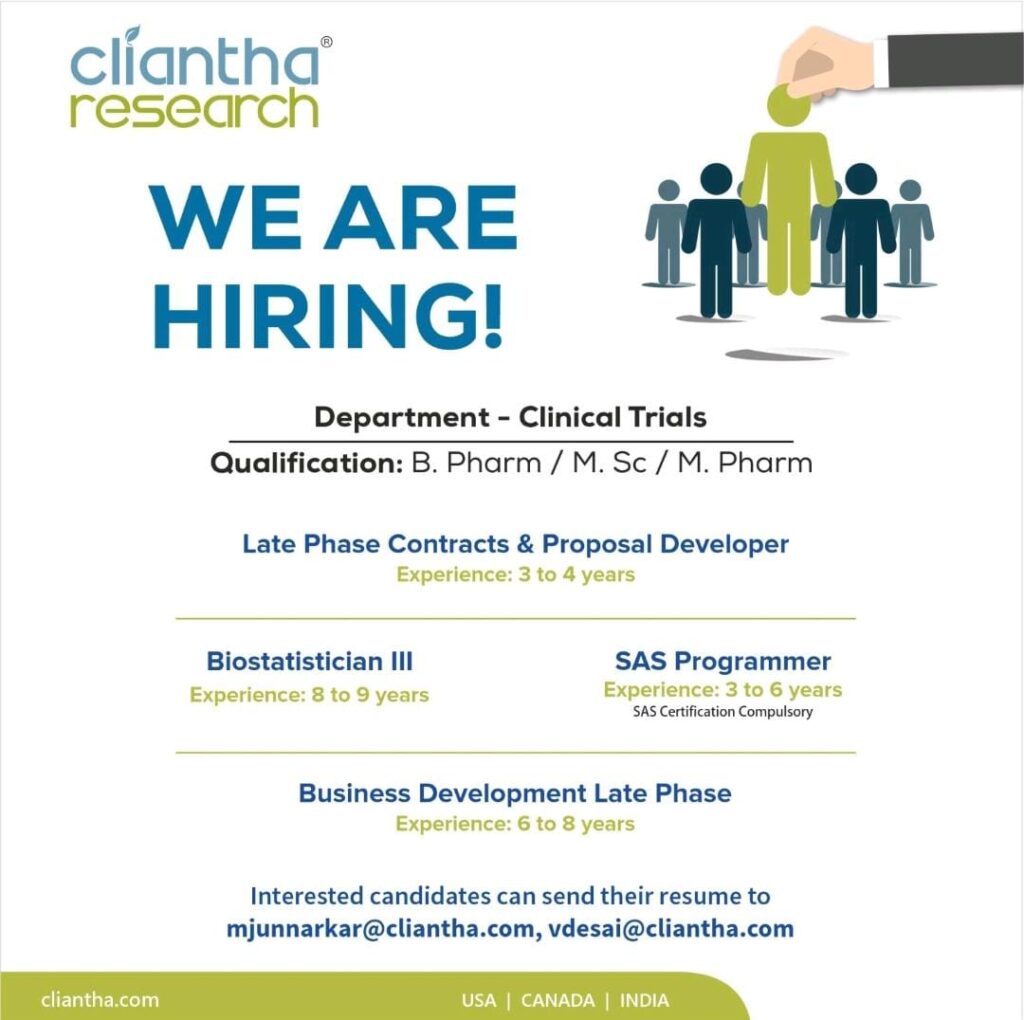 Cliantha Research hiring for multiple position in Clinical Trials – Biostatistician III, SAS Programmer, Business Development Late Phase, Late Phase Contracts & Proposal Developer