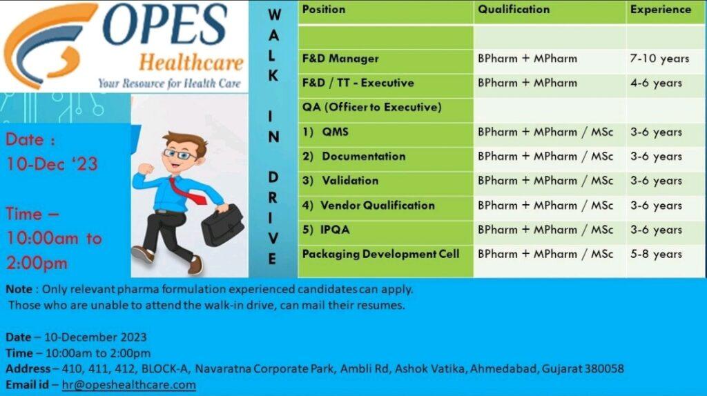 OPES Healthcare is conducting a walk-in drive across multiple pharma positions on 10-December 2023