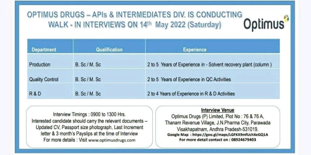 OPTIMUS DRUGS – APIS & INTERMEDIATES DIV. IS CONDUCTING WALK-IN INTERVIEWS ON 14th May 2022 (Saturday)