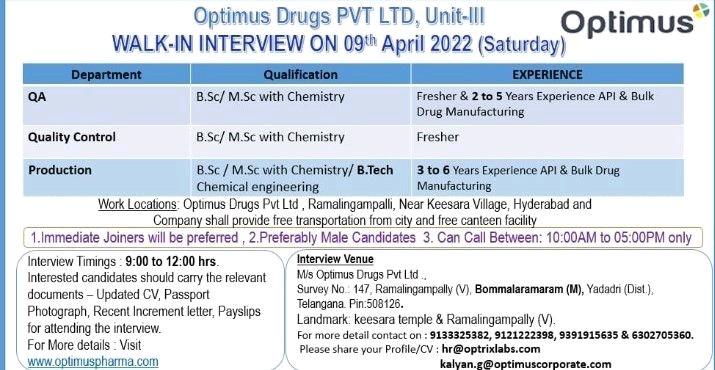 Optimus Drugs PVT LTD, Unit-III Walk In Interview for Freshers & experience in QA, QC, Production on 09th April 2022