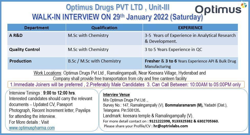 Optimus Drugs Pvt. Ltd, Unit-III- WALK-IN DRIVE for FRESHERS AND EXPERIENCED in Production , AR&D & QC Department 29th January’2022(Saturday) on Between 09:00 AM to 12:00 PM only.