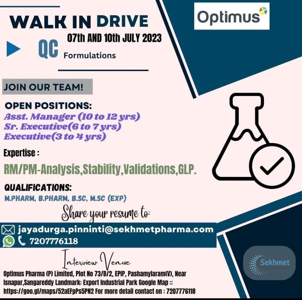 Optimus Pharma (P) Limited Walk In Interview on 07th & 10th July 2023