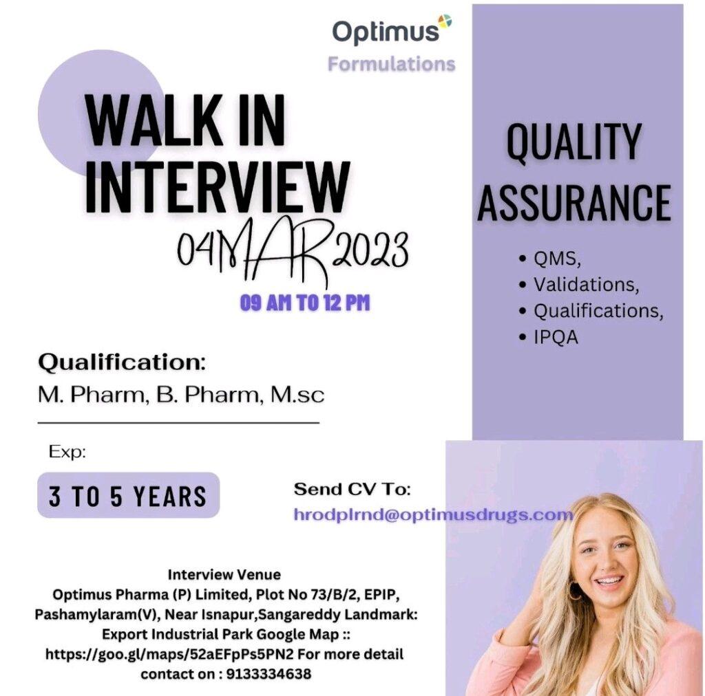 Optimus Pharma Pvt Ltd- Walk In Interview for multiple opening in Quality Assurance on 04th March 2023