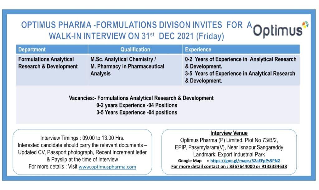 Optimus Pharma Walk-in Interview for Formulation Analytical department FAR&D on 31st Dec 2021 Friday at Pashamylaram, Hyderabad, India