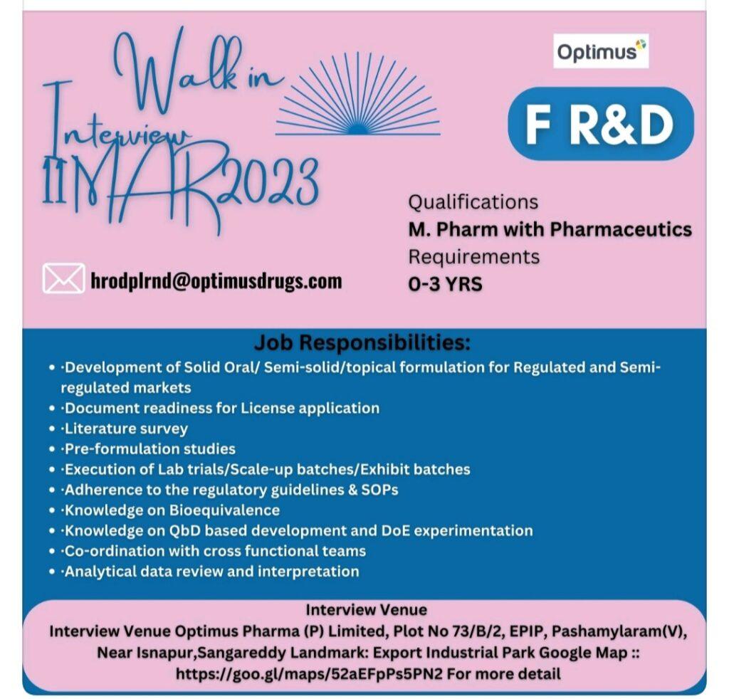 Optimus Pharma- Walk In Interview for FRESHERS in FR&D department on 11 March 2023