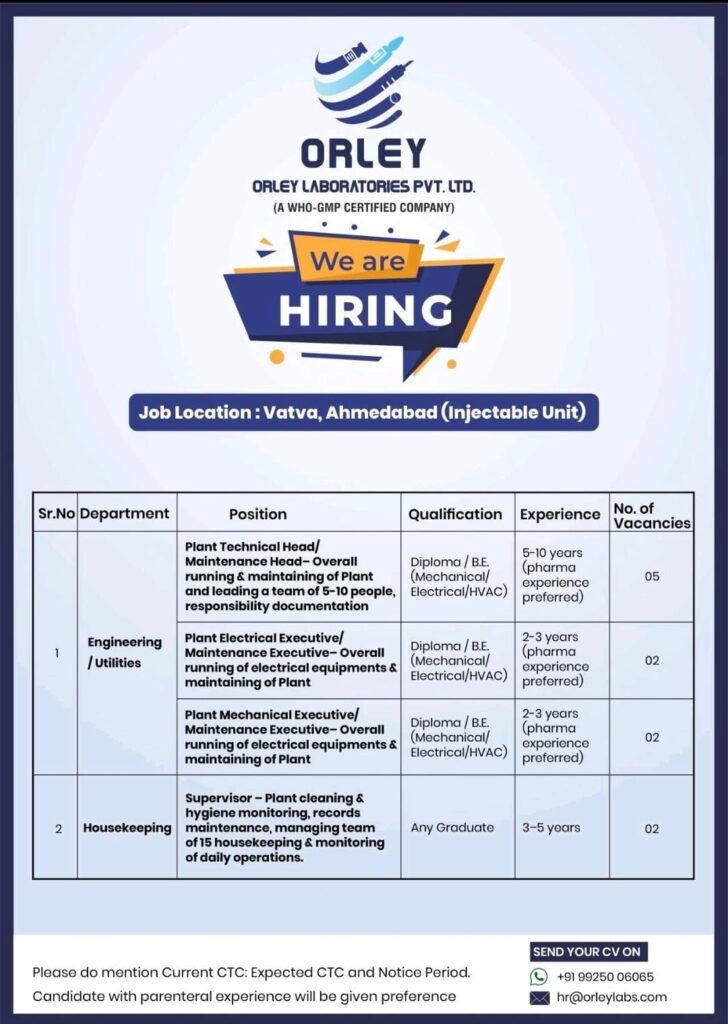 Orley Laboratories Pvt. Ltd., a WHO-GMP certified pharmaceutical company, has announced multiple job openings for its Injectable Manufacturing Unit located in Vatva, Ahmedabad. The company is seeking qualified and experienced professionals in Engineering / Utilities and Housekeeping departments.