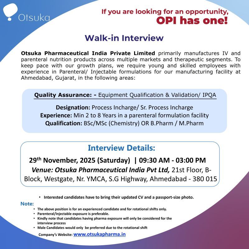 Otsuka Pharmaceutical India Private Limited (OPI), a leading manufacturer of IV and parenteral nutrition products, has announced a walk-in interview for experienced professionals in Quality Assurance (QA). The company seeks talented and skilled candidates with hands-on experience in parenteral or injectable formulations, aiming to strengthen its manufacturing facility in Ahmedabad, Gujarat.