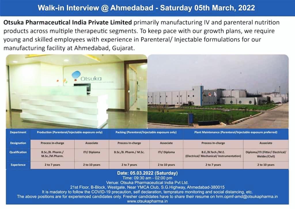 Walk-in Interview @ Otsuka Pharmaceutical, Ahmedabad on 05th March ’22