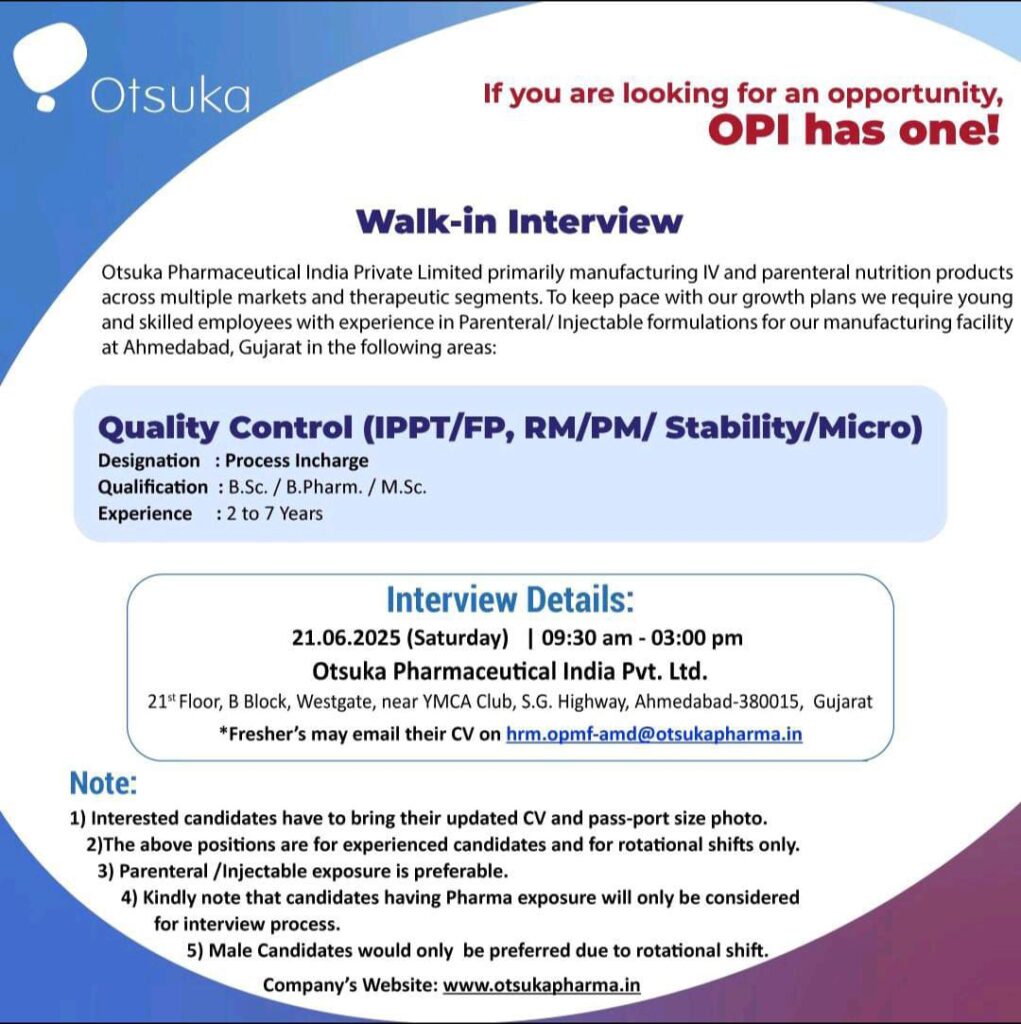 Fresher’s may email their CV on hrm.opmf-amd@otsukapharma.in