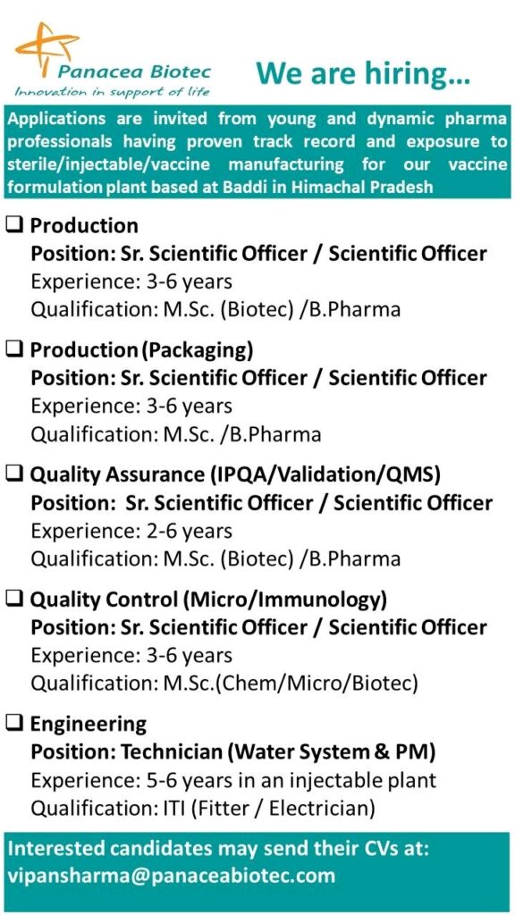 Panacea Biotec hiring for Production, Packing, Quality Assurance (IPQA/Validation/QMS), QC & Engineering department