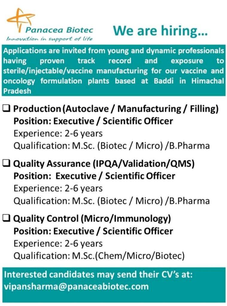 Panacea Biotec – hiring for Quality Assurance (IPQA/Validation/QMS), Quality Control (Micro/ Immunology), Production (Autoclave / Manufacturing / Filling) Apply Now