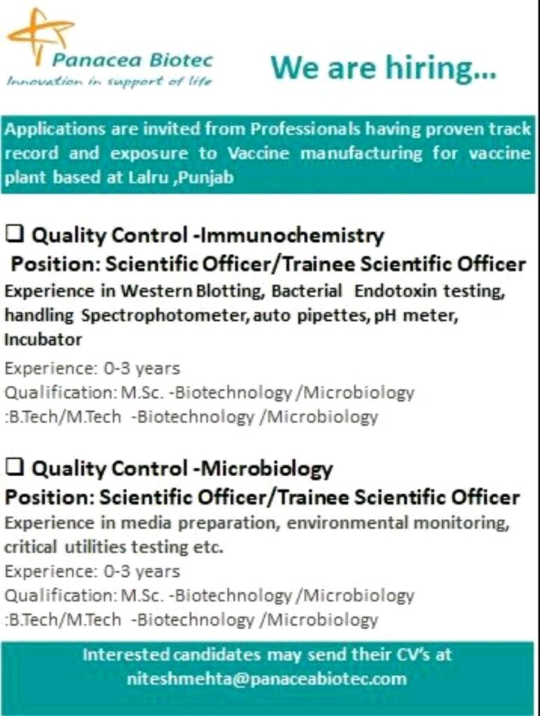 Interested candidates may send their CV’s at niteshmehta@panaceabiotec.com