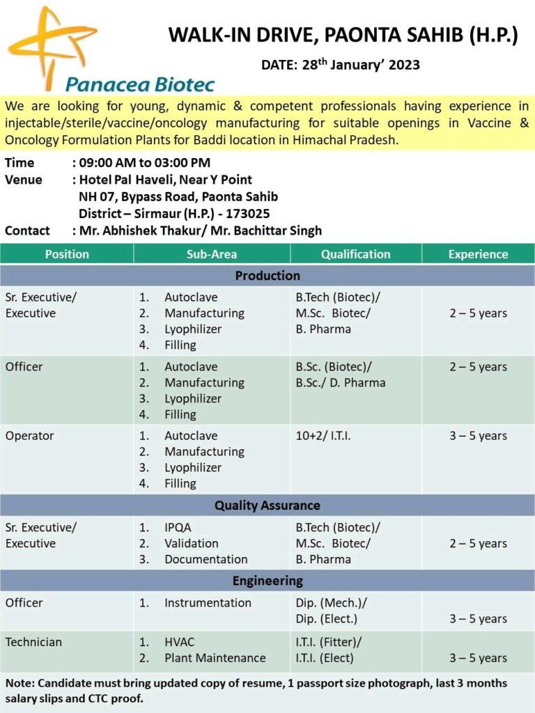 We are looking for young, dynamic & competent professionals having experience in injectable/sterile/vaccine/oncology manufacturing for suitable openings in Vaccine & Oncology Formulation Plants for Baddi location in Himachal Pradesh.