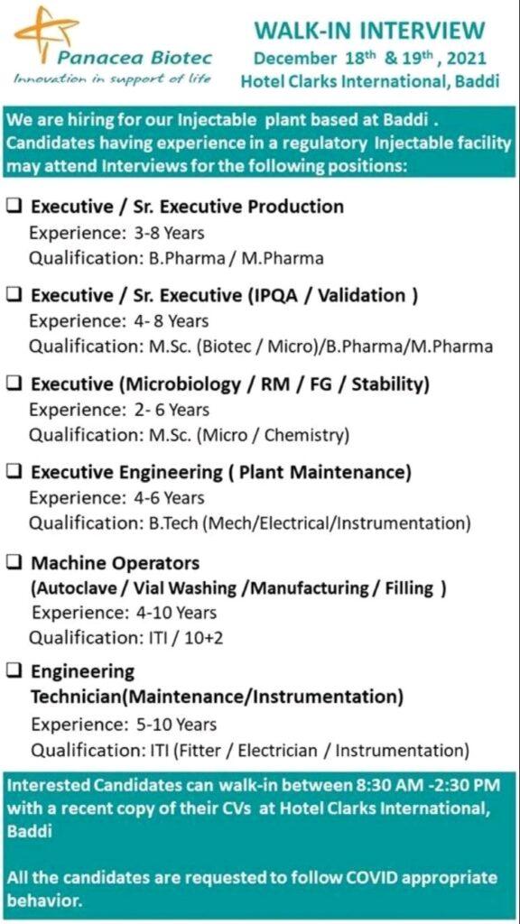 Panacea Biotech, Walk In Interview for Production/ QA/ QC & Engineering on 18th & 19th Dec’21