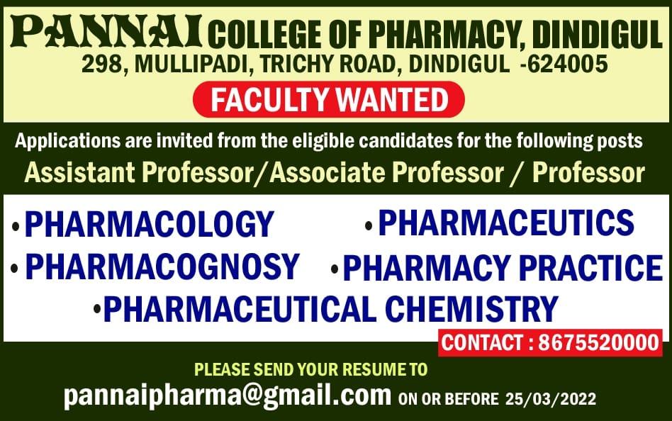 PANNAI COLLEGE OF PHARMACY Inviting applications from Freshers & experience for Assistant Professor/Associate Professor / Professor in PHARMACOLOGY, PHARMACEUTICS, PHARMACOGNOSY, PHARMACY PRACTICE & CHEMISTRY