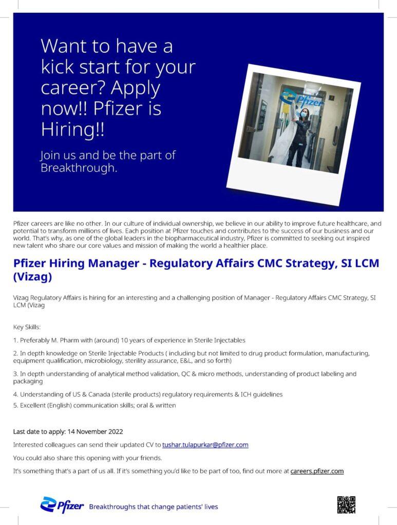 Pfizer Hiring Manager – Regulatory Affairs CMC Strategy, SI LCM (Vizag)