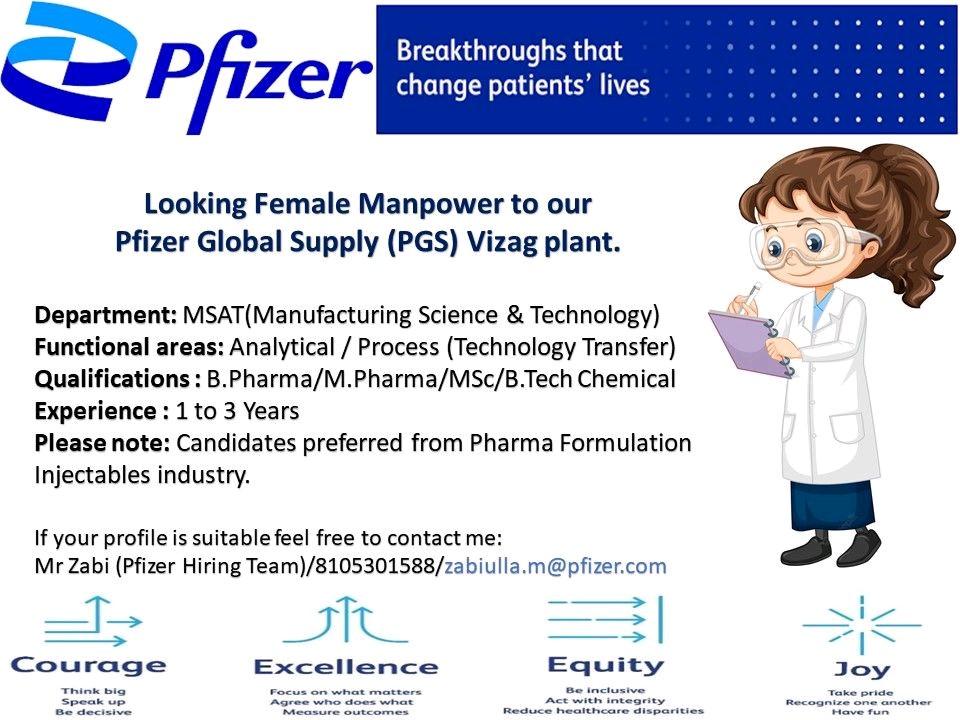 Pfizer looking Female Manpower for MSAT (Manufacturing Science & Technology)- Global Supply (PGS) Vizag plant