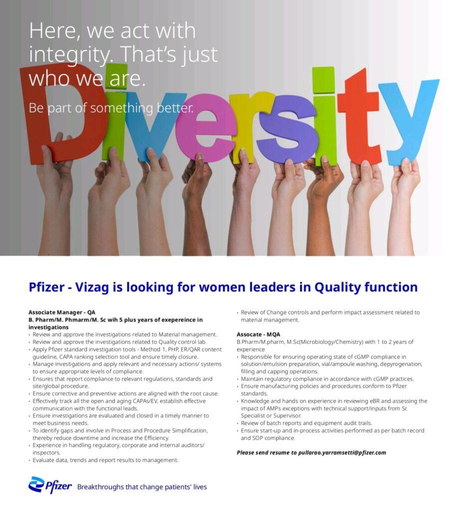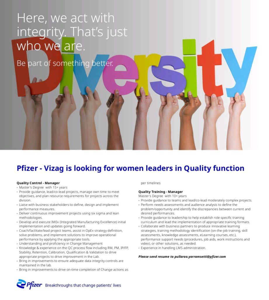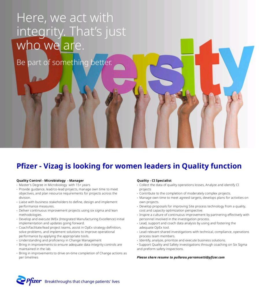 Pfizer – Vizag is looking for women leaders in Quality function (Microbiology – Manager/ CI Specialist/ Quality Control/ Quality Training/ Assocate – MQA) Apply Now