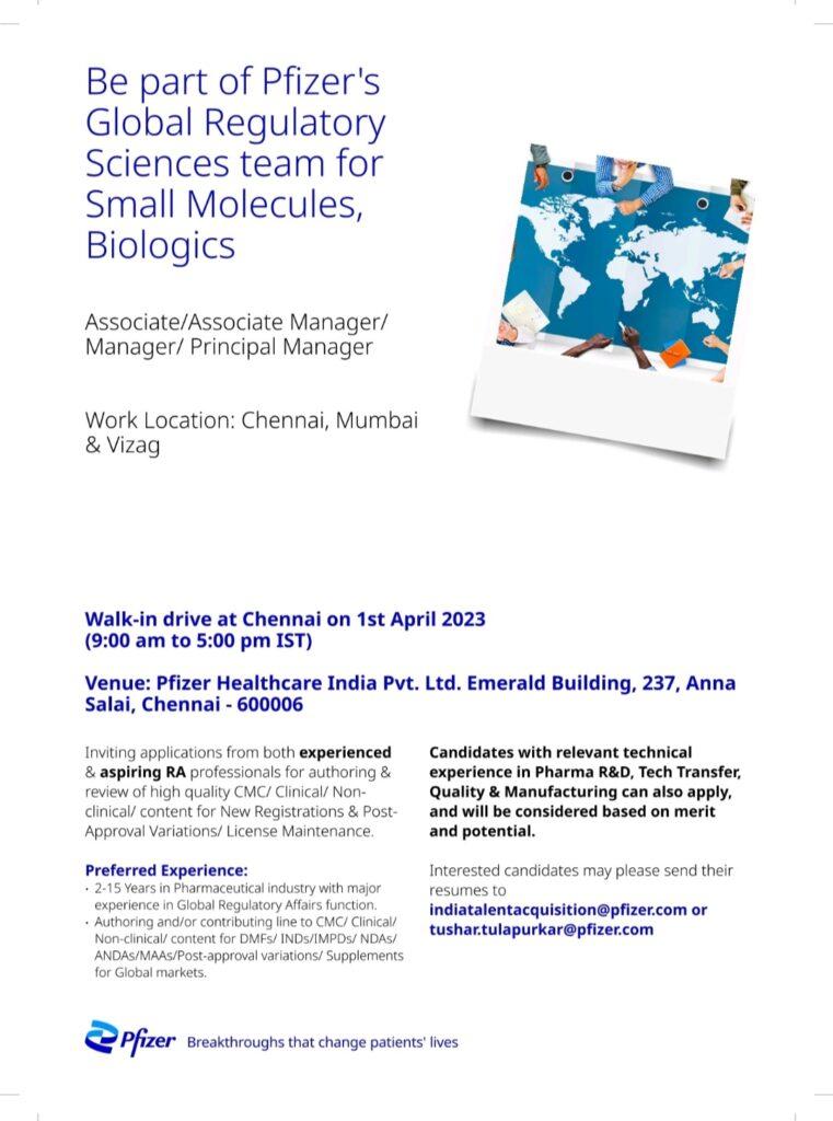 Keen on building a career with Pfizer’s Regulatory Team, Come meet our Business Leaders and Talent Acquisition team at our Chennai Office on 1st April 2023