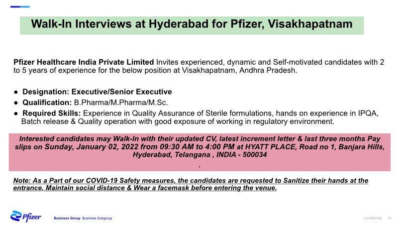 Pfizer : Walk-In-Interview for experienced candidates at Hyderabad on Sunday, 2nd January 2022