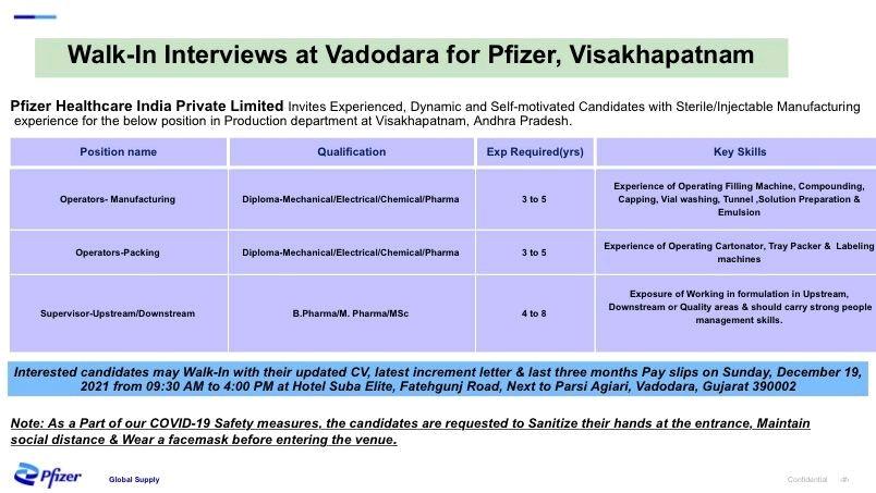 - Pfizer Healthcare India Walk-In Drive 2026 – Vizag | Manufacturing & Engineering Roles