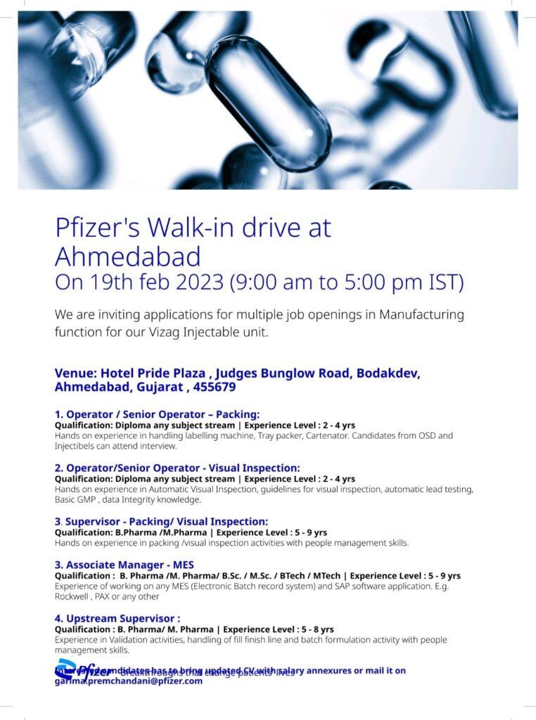 Pfizer’s Walk-in drive at Ahmedabad On 19th feb 2023 (9:00 am to 5:00 pm IST)