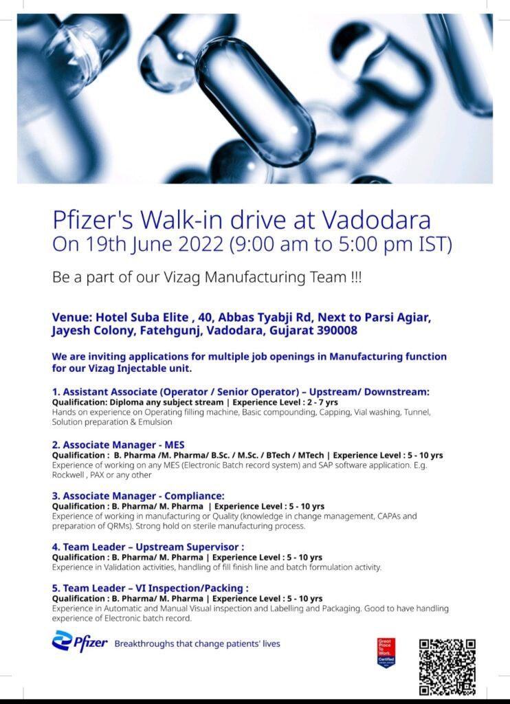Interested candidates are requested to walk-in to the venue. The applicants are also suggested to fill up the registration form in advance or at the venue by scanning QR code shared in the flyer and share the profile with Garima.Premchandani@pfizer.com with the respective job title in the subject line.