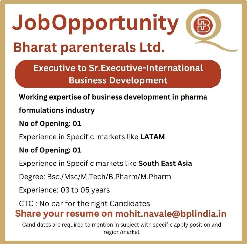 Bharat Parenterals Ltd., a leading name in the pharmaceutical formulations industry, has announced new job opportunities for professionals specializing in international business development. The company is seeking candidates for the position of Executive to Senior Executive in International Business Development, with a focus on expanding its presence in key global markets.