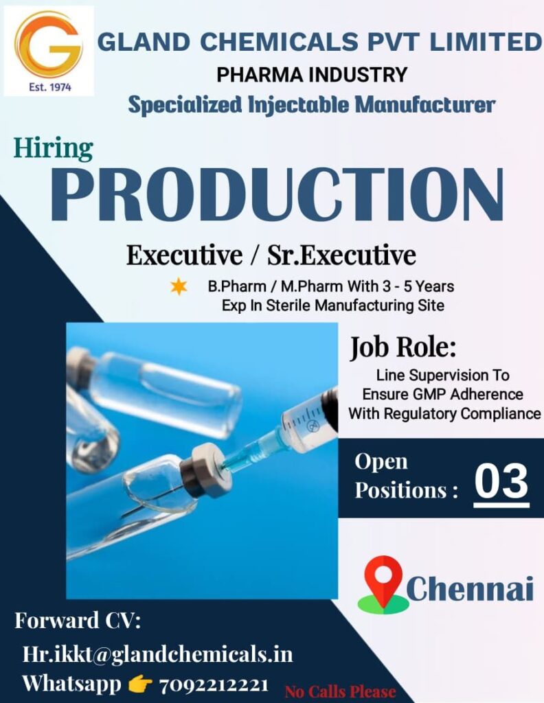 Gland Chemicals Pvt Limited, a specialized injectable manufacturer established in 1974, has announced an immediate hiring opening within its production department. This opportunity is tailored for pharmaceutical professionals looking to advance their careers in a specialized manufacturing environment in Chennai.
