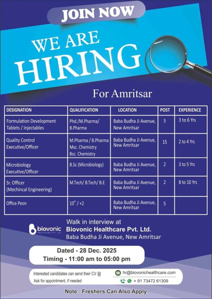 Biovonic Healthcare Pvt. Ltd. is hosting a significant recruitment drive for its facility in Amritsar, offering a variety of roles for both experienced professionals and freshers. This walk-in interview event is a prime opportunity for those looking to advance their careers in the pharmaceutical and engineering sectors.