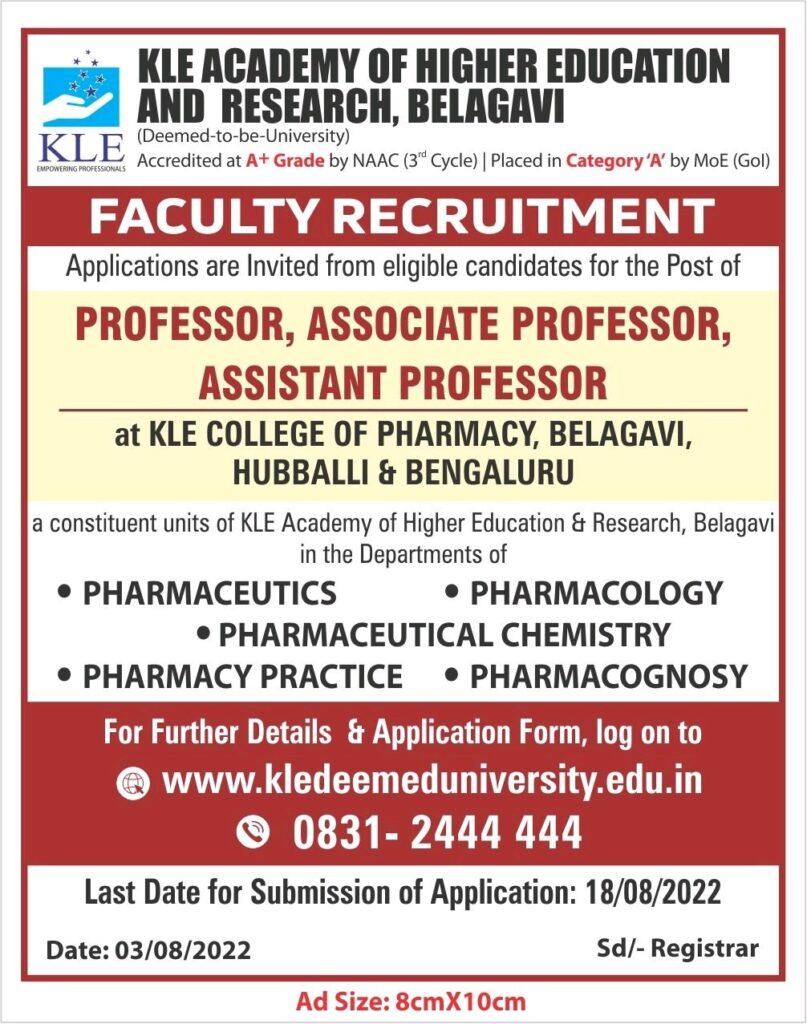 Pharma Faculty Requirement at KLE College of Pharmacy, Belagavi, Hubballi & Bengaluru- Apply Now