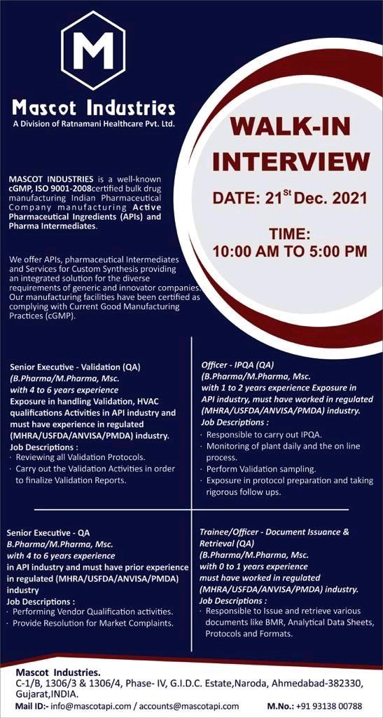 Mascot Industries, Walk In Interview for multiple opening in QA on 21st December 2021