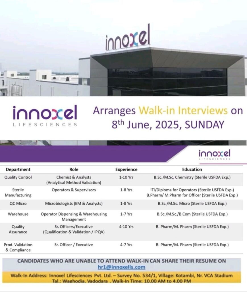 Innoxel Lifesciences, a prominent name in the pharmaceutical and life sciences sector, has announced a walk-in interview drive scheduled for Sunday, June 8, 2025. The event will take place at their state-of-the-art facility, offering a range of opportunities for professionals across multiple departments.