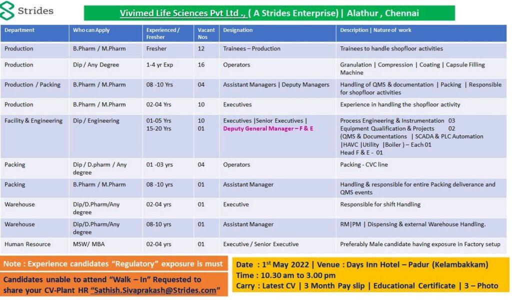 Candidates unable to attend “Walk-In” Requested to share your CV-Plant HR “Sathish.Sivaprakash@Strides.com“