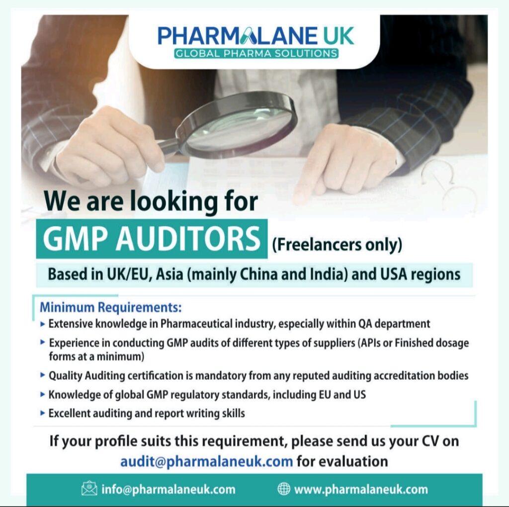 PHARMALANE UK looking for several GMP AUDITORS (Freelancers) based in UK/EU, Asia (mainly China and India) and USA regions