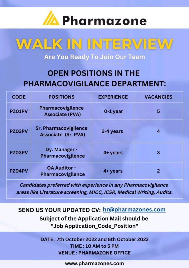 Pharmazone Walk in interview for multiple opening in Pharmacovigilence department on 7th & 8th October 2022 – Experienced and freshers can apply