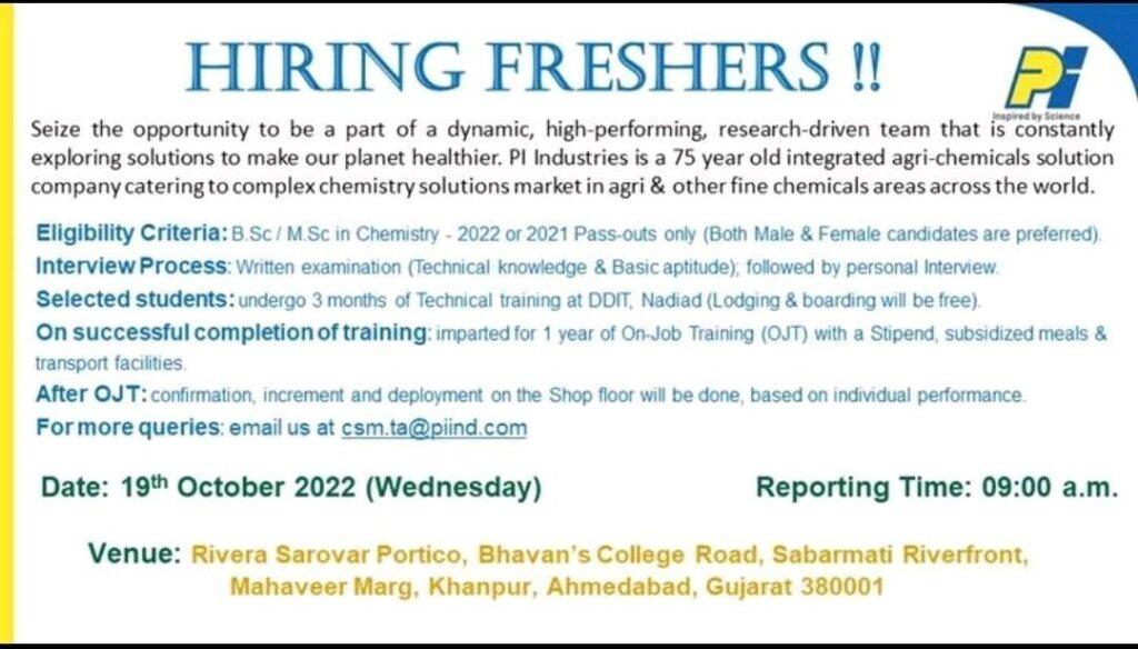 PI Industries Ltd Walk In Interview for FRESHERS on 19th October 2022