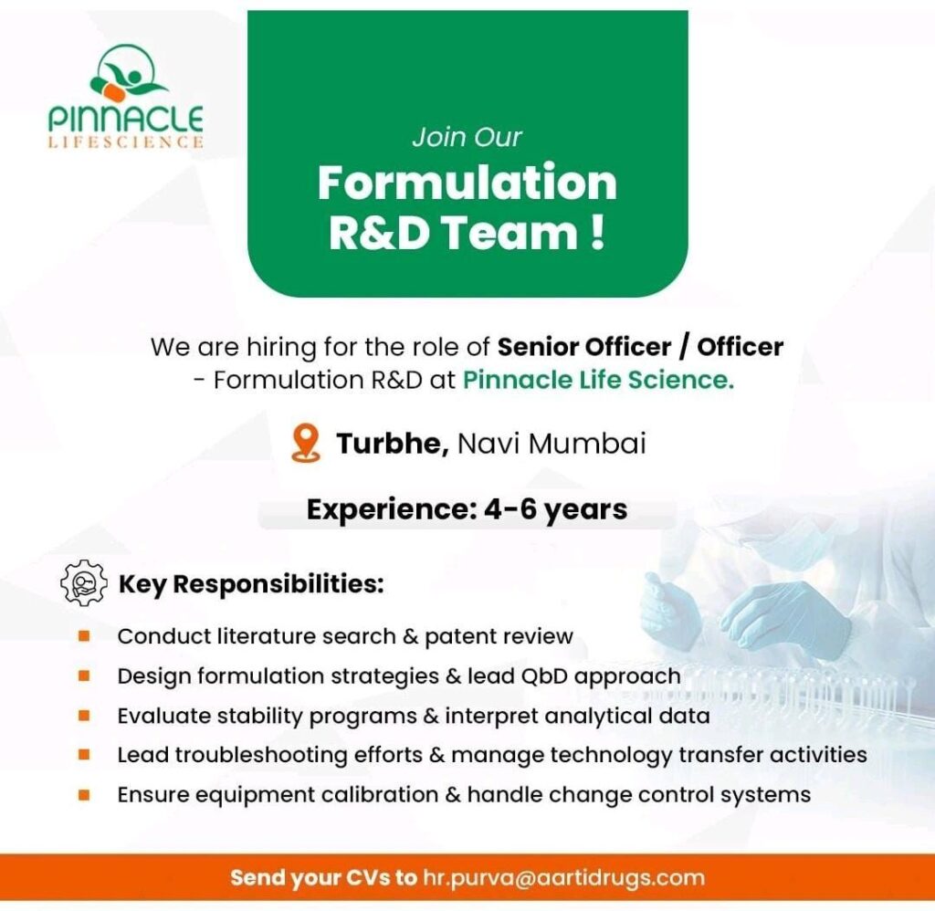 Pinnacle Life Science is hiring an Senior Officer / Officer – Formulation R&D department